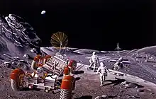 In 1977 finally the first sustained space habitat the Salyut 6 station was put into Earth's orbit. Eventually the first space stations were succeeded by the ISS, today's largest human outpost in space and closest to a space settlement. Built and operated under a multilateral regime it has become a blueprint for future stations, such as around and possibly on the Moon.[23] An international regime for lunar activity was demanded by the international Moon Treaty, but is currently developed multilaterally as with the Artemis Accords.[25][26] The only habitation on a different celestial body so far have been the temporary habitats of the crewed lunar landers.