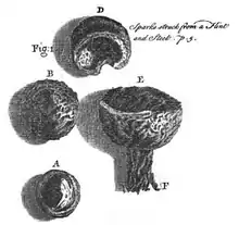 Robert Hooke studied the sparks created by striking a piece of flint and steel together. He found that the sparks were usually particles of the steel that had become red hot and so melted into globules.[8] These sparks can be used to ignite tinder and so start a fire.[9]