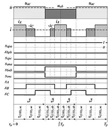 Fig 6 shows the formation of the dc-link voltage u and dc-link current i within one switching period Furthermore, it shows as an example the switching functions of the rectifier and inverter stage for in interval and in interval . Input stage switching occurs at zero dc-link current. The dc-link current has a constant average value within and . The switching state functions are given as , and . The switching frequency ripple of and is neglected.