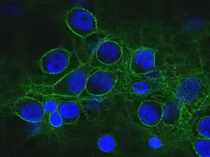 Spectrin is a cytoskeletal protein that lines the intracellular side of the plasma membrane in eukaryotic cells. Spectrin forms pentagonal or hexagonal arrangements, forming a scaffold and playing an important role in maintenance of plasma membrane integrity and cytoskeletal structure.[1] The hexagonal arrangements are formed by tetramers of spectrin subunits associating with short actin filaments at either end of the tetramer. These short actin filaments act as junctional complexes allowing the formation of the hexagonal mesh. The protein is named spectrin since it was first isolated as a major protein component of human red blood cells which had been treated with mild detergents; the detergents lysed the cells and the hemoglobin and other cytoplasmic components were washed out. In the light microscope the basic shape of the red blood cell could still be seen as the spectrin-containing submembranous cytoskeleton preserved the shape of the cell in outline. This became known as a red blood cell "ghost" (spectre), and so the major protein of the ghost was named spectrin.