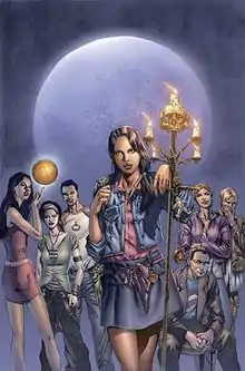 ![]() Cover to Spellbinders #1. Picture from left to right Mason, Renata, Paul, Kim, Foley, Mink, and Liza Beth. Art by Mike Perkins. | |