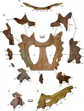 The relatively flat skull frill has a triangular profile in top view, with slightly convex sides and diverging rear corners separated by a broad notch on the rear edge. The structure is pierced by large elongated openings, the parietal fenestrae. The frill of Spiclypeus features a unique pattern of skin ossifications or osteoderms ornamenting its edge. The side bones of the neck shield, the squamosals, bear episquamosals, with the holotype individual six on the left side and seven on the right side. The front episquamosal projects into the jugal notch between the frill and the cheek elements and forms a triangle six to seven centimetres in length. More to the rear, the episquamosals gradually become wider and lower, but ultimately increase in length again.[1]