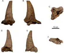 The skull has a reconstructed length of 167 centimetres. The rostral bone, the core of the upper beak, is strongly hooked. The ascending branch of the praemaxilla has a very rough outer surface, with many deep pits, indicating a strong connection to the nasal bone. The depressions on the outer sides of the praemaxillae are not connected by a perforation, though the separating bone sheath is very thin at one millimetre. The triangular nose horn has a length of 166 millimetres. The maxilla has at least twenty-eight positions in the tooth battery, each featuring three to five stacked teeth. The postorbital, or brow, horns are 228 (left) and 246 (right) millimetres long. They strongly project to the side, at an angle of 50° with the midline of the skull. Their points gradually curve to below.[1]