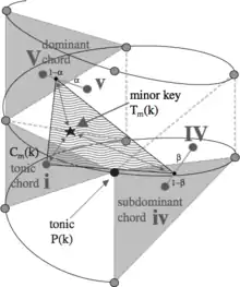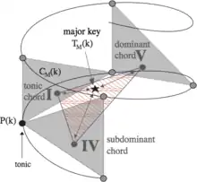 In music theory, the spiral array model is an extended type of pitch space. A mathematical model involving concentric helices (an "array of spirals"), it represents human perceptions of pitches, chords, and keys in the same geometric space. It was proposed in 2000 by Elaine Chew in her MIT doctoral thesis Toward a Mathematical Model of Tonality.[1] Further research by Chew and others have produced modifications of the spiral array model, and, applied it to various problems in music theory and practice, such as key finding (symbolic and audio[2][3]), pitch spelling,[4][5][6][7] tonal segmentation,[8][9] similarity assessment,[10] and musical humor.[11] The extensions and applications are described in Mathematical and Computational Modeling of Tonality: Theory and Applications.[12]