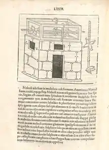 A springald, or espringal, was a medieval torsion artillery device for throwing bolts. It is depicted in a diagram in an 11th-century Byzantine manuscript, but in Western Europe is more evident in the late 12th century and early 13th century. It was constructed on the same principles as an Ancient Greek or Roman ballista, but with inward swinging arms and threw bolts instead of stones. It was also known as a 'skein-bow', and was a torsion device using twisted skeins of silk or sinew to power two bow-arms.[1]