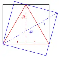 An equilateral triangle with circumscribed rectangle and square; the side of the square is , and the diagonal of the rectangle is the square root of 7.