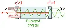 The principle of the squeezing resonator is the following: The medium parametrically attenuates the electric field inside the resonator to such a value that perfect destructive interference is achieved outside the resonator for the attenuated field quadrature. The optimum field attenuation factor inside the resonator is slightly below 2, depending on the reflectivity of the resonator mirror.[8] This principle also works for electric field uncertainties. Inside the resonator, the squeeze factor is always less than 6 dB, but outside the resonator it can be arbitrarily high. If quadrature is squeezed, quadrature is anti-squeezed – inside as well as outside the resonator. It can be shown that the highest squeeze factor for one quadrature is achieved if the resonator is at its threshold for the orthogonal quadrature. At threshold and above, the pump field is converted into a bright field at optical frequency . Squeezing resonators are usually operated slightly below threshold, for instance, to avoid damage to the photo diodes due to the bright down-converted field.
