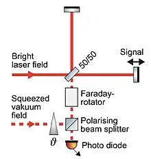 Squeezed light is used to reduce the photon counting noise (shot noise) in optical high-precision measurements, most notably in laser interferometers. There are a large number of proof-of-principle experiments.[18][19] Laser interferometers split a laser beam in two paths and overlap them again afterwards. If the relative optical path length changes, the interference changes, and the light power in the interferometer's output port as well. This light power is detected with a photo diode providing a continuous voltage signal. If for instance the position of one interferometer mirror vibrates and thereby causes an oscillating path length difference, the output light has an amplitude modulation of the same frequency. Independent of the existence of such a (classical) signal, a beam of light always carries at least the vacuum state uncertainty (see above). The (modulation) signal with respect to this uncertainty can be improved by using a higher light power inside the interferometer arms, since the signal increases with the light power. This is the reason (in fact the only one) why Michelson interferometers for the detection of gravitational waves use very high optical power. High light power, however, produces technical problems. Mirror surfaces absorb parts of the light, become warmer, get thermally deformed and reduce the interferometer's interference contrast. Furthermore, an excessive light power can excite unstable mechanical vibrations of the mirrors. These consequences are mitigated if squeezed states of light are used for improving the signal-to-noise-ratio. Squeezed states of light do not increase the light's power. They also do not increase the signal, but instead reduce the noise.[8]