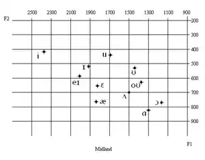 - Lowering of /eɪ/ (FACE): the diphthong /eɪ/ (as in face, reign, day, etc.) often has a lower nucleus than the Northern accents just above Midland region.[24]