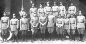 In Brazil, the gymnastic belt (Portuguese: cinto ginástico) is one of the most traditional elements of the uniforms of the Military Firefighters Corps. It has been used with few modifications since 1887.[6] Made of cotton and leather, earlier examples were reinforced to serve as climbing harnesses. Modern gymnastic belts are of lighter construction and only worn as ceremonial item. There are two versions of the gymnastics belt: