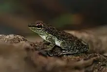 Staurois is a small genus of minuscule true frogs. Most species in the genus are restricted to Borneo, but two species are from the Philippines.[1][2] This genus is a quite ancient member of the true frog family, Ranidae.[3] They are typically found in or near rapidly flowing, small rocky streams, and are sometimes known as splash frogs or foot-flagging frogs. The latter name refers to their unusual behavior of conspicuously waving their hindlegs and feet, as a way of signalling other members of the species.[4][5] Similar behavior has also been documented in other frog genera, notably Hylodes and Micrixalus.