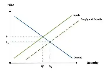 Competitive equilibrium is a state of balance between buyers and suppliers, in which the quantity demanded of a good is the quantity supplied at a specified price. When the price falls the quantity demand exceeds the equilibrium quantity, conversely, a reduction in the supply of a good beyond equilibrium quantity implies an increase in the price. The effect of a subsidy is to shift the supply or demand curve to the right (i.e. increases the supply or demand) by the amount of the subsidy. If a consumer is receiving the subsidy, a lower price of a good resulting from the marginal subsidy on consumption increases demand, shifting the demand curve to the right. If a supplier is receiving the subsidy, an increase in the price (revenue) resulting from the marginal subsidy on production results increases supply, shifting the supply curve to the right.