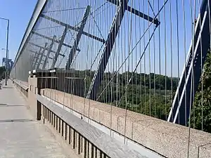 Suicide prevention advocates believe that suicide by bridge is more likely to be impulsive than other means, and that barriers can have a significant effect on reducing the incidence of suicides by bridge.[4] One study showed that installing barriers on the Duke Ellington Bridge in Washington, D.C.—which has a high incidence of suicide[5]—did not cause an increase of suicides at the nearby Taft Bridge.[6] A similar result was seen when barriers were erected on the popular suicide bridge: the Clifton Suspension Bridge, in the United Kingdom.[7] Families affected and groups that help the mentally ill have lobbied governments to erect similar barriers. One such barrier is the Luminous Veil on the Prince Edward Viaduct in Toronto, Canada, once considered North America's second deadliest bridge, with over 400 jumps on record.[8]