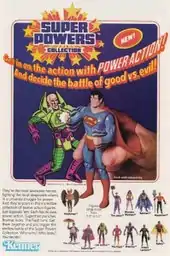 In 1984, DC Comics awarded the master toy license of their characters to Kenner Products, hot on the heels of Mattel's "action feature" heavy Masters of the Universe toy line. The initial pitch seemed to be heavily influenced by Kenner's popular Star Wars toyline with multiple playsets dedicated to individual franchises like Superman, Batman, Wonder Woman, Green Lantern, Teen Titans, Lois Lane, and the Super Jrs.[1] Winning the license away from Knickerbocker and Mattel in 1982 with an emphasis on action and art, Kenner devised hidden mechanisms within the figures that would trigger an action when the figure's legs or arms were squeezed. This emphasis on each figure's "super power" led to the naming of the line: "The Super Powers Collection". Each figure in the first two series were also packaged with a mini-comic featuring an adventure with a spotlight on that character.