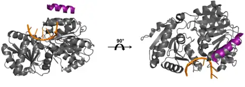 DDX39, or U2AF65-associated protein 56 (UAP56, Sub2 in yeast) is a DEAD-box ATPase essential for pre-mRNA splicing,[13] but is also a key component of the TREX complex. DDX39 is very similar to UAP56, sharing 90% of the amino acid sequence.[1] UAP56 travels along genes with the THO complex, where it interacts with the sugar-phosphate backbone of the mRNA.[14] UAP56 functions to recruit ALYREF, an RNA export adaptor, to the spliced or intronless mRNA.[15][6] After transfer of the mRNA from UAP56 to ALYREF, UAP56 dissociates from the complex, allowing the binding of export factor NXF1 to ALYREF at the same site.[16][4]