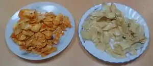The dish is prepared using raw cassava tubers, whereby the inner rind and outer skin are removed.[1] The chips are then fried or deep fried in coconut oil, salted and often spiced with red chili powder.