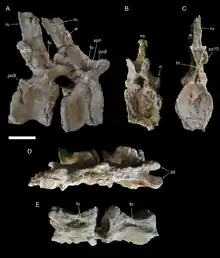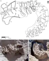 The first known elements of the holotype were discovered in the Aïn el Guettar Formation in 2011 by Aldo Luigi Bacchetta, but he was unable to excavate the specimen until 2012. The remains were subsequently studied by Federico Fanti, Andrea Cau, Mohsen Hassine and Michela Contessi. The genus was named in 2013. The name refers to the Tataouine Governatorate, Tunisia, and Hannibal.[2] In 2015 more material of the holotype specimen was uncovered after the initial description were analysed.[3] These included additional tail vertebrae.