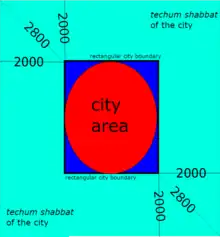 To calculate the techum for a city, it is first necessary to determine the city boundary from which the 2000 cubits are to be measured. A city may be of any shape, but the boundary used for this purpose is always a rectangle - the smallest rectangle which can contain the entire city. If the city is rectangular or close to rectangular in shape, the rectangle used for measurement will follow the edges of the city. If the city has an irregular shape, the rectangle follows the cardinal directions.[15]) The measurement of 2000 cubits for a city's techum begins at the edge of this rectangle. However, if a city has a concave shape and the "edges" of the concave hollow are more than 4000 cubits apart, parts of the hollow located more than 2000 cubits from the city are not included in the techum rectangle.[16]