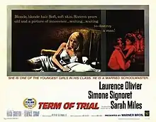 Term of Trial is a 1962 British drama film written and directed by Peter Glenville and produced by James Woolf for his Romulus Films company, with James H. Ware as associate producer. Its screenplay was based on the 1961 novel of the same name by James Barlow. The music score was by Jean-Michel Damase and the cinematography by Oswald Morris.