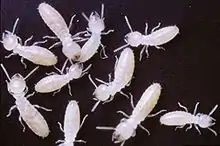 Termites are a group of detritophagous eusocial insects which consume a wide variety of decaying plant material, generally in the form of wood, leaf litter, and soil humus. They are distinguished by their moniliform antennae and the soft-bodied and typically unpigmented worker caste for which they have been commonly termed "white ants"; however, they are not ants, to which they are distantly related.[3] About 2,972 extant species are currently described, 2,105 of which are members of the family Termitidae.