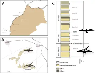 The holotype, FSAC-OB 1, was found in the middle Couche III, itself the lowest phosphate layer complex at Sidi Daoui, dating from the late Maastrichtian. It consists of a left humerus. The bone is relatively crushed. Other specimens have been referred to the species. FSAC-OB 199 is an ulna. FSAC-OB 200 is another ulna. FSAC-OB 201 is a thighbone. FSAC-OB 202 consists of a thighbone with shinbone. The describing authors admitted that a connection between the holotype and the referred specimens is hard to prove, in view of the lack of overlapping material. However, the wide ulnae fit the exceptional distal width of the humerus. The thighbones were, more tentatively, referred because they seemed to be pteranodontid.[1]