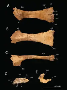 In 2020, a wing from the same deposit was assigned to the genus; however, the morphology suggested that Tethydraco was an azhdarchid, rather than a pteranodontid as originally proposed, and possibly represented the wing-elements of Phosphatodraco.[4] In 2022, researchers who described Epapatelo noted that the humerus of Epapatelo shares similarity with that of Tethydraco and other non-Nyctosaurus pteranodontoids, and recovered Tethydraco as a pteranodontian closely related to Pteranodon.[5]