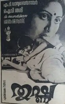 Thrishna is a 1981 Indian Malayalam film written by M. T Vasudevan Nair , directed by I. V. Sasi and produced by Rosamma George. The film has musical score by Shyam. The film stars Mammootty, Rajyalakshmi, Swapna and Kaviyoor Ponnamma in the lead roles. The film gave Mammootty his major break as a solo hero. The film tells the story of Das (Mammootty), who is a rich playboy and his relationships with his callgirl, Jaysree (Swapna) and his love interest, Sridevi (Rajyalakshmi). Rosamma George won the 1981 Filmfare Award for Best Film - Malayalam for this film.[1][2][3][4][5][6][7]