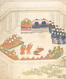 The office of the two Ambans was set up in 1728. They were imperial residents of the Qing dynasty and reported to the Qing government agency known as the Lifan Yuan. Prior to that there were no permanent representatives of the Qing emperor in Tibet and the temporary representative after 1720 was withdrawn in 1723. Between 1723 and 1728, there were special missions to Lhasa but no permanent residence. The fact that two ambans with their Chinese garrison have been stationed in Lhasa since 1728 is significant because it shows that Manchu China had effectively taken over the position of the former Mongol protector of the lamaist regime.[57] There was a senior and junior amban but the distinction was purely formal and they both held the same authority. Between the death of A'erxun in 1734 and 1748, there was only one amban. The first two ambans, Sengge and Mala, held office for five years, but thereafter ambans held office for a maximum of three years. During the rule of Polhané, the ambans' duties mainly consisted of commanding the Qing garrison and communications with Beijing on the actions of the Tibetan ruler. During the initial period they sometimes intervened in matters of foreign relations but they never interfered with the Tibetan government at that time. In 1751, the power of the ambans was increased. Besides their former duties, their directions also had to be taken by the Kashag on every important matter, giving them broad supervision over the Tibetan government. Direct intervention by the ambans was still a rare occurrence until after the Sino-Nepalese War in 1792.[52] By 1793, the ambans were accorded the same rank as the Dalai and Panchen Lamas, and these two high-ranking Lamas were denied the traditional right of communicating directly with the Emperor; they could only do so via the ambans. By this time the ambans were also above the Kashag and regents in regards to Tibetan political affairs. Over a period of 184 years, the amban's status changed from consultative to supervisory and finally to commanding official in Lhasa.[58] The staff of the ambans included one or two military officers and several clerics. The clerics' function was probably similar to that of secretaries. After 1751, a number of Manchu banner officers were added.[59]