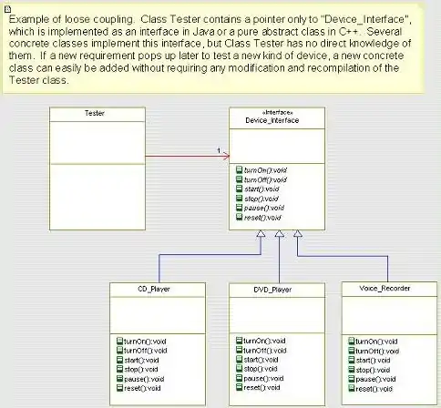 This is a UML diagram illustrating an example of loose coupling between a dependent class and a set of concrete classes, which provide the required behavior: