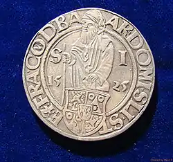 Tolar (German: Thaler) or Jáchymovský tolar is the Czech name for the silver coin minted in Kingdom of Bohemia from 1520 until 1672 in Jáchymov (German: Joachimsthal). On obverse of the coin is depicted Saint Joachim with coat-of-arms of the noble family Schlik, who founded the mint in Ore mountains, with titles of brothers Schlicks in inscription:"STEPHANI:ET:FRATRVM: COMITVM:DE:BASSANO" (without abbreviations). On reverse side is depicted the crowned Bohemian lion with title of the Bohemian King Louis of Jagiellonian dynasty: (without abbreviations):"LVDOVICVS DEI GRACIA REX BOHEMIAE".