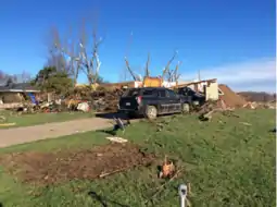 A significant tornado outbreak occurred across an area extending from Colorado to Kentucky, beginning with a large multiple-vortex EF2 tornado that tossed several RVs and injured two people near Wiggins, Colorado on May 7. Later that evening, a large stovepipe tornado caused high-end EF2 damage near Wray, while several other tornadoes tracked across other very rural areas of Colorado, causing no damage.[42] Scattered tornadoes occurred on May 8, most of which were weak. However, a strong EF2 tornado caused considerable damage to outbuildings and high-voltage transmission line poles near Catharine, Kansas. On May 9, a significant tornado event unfolded across Oklahoma, as several strong to violent tornadoes touched down and caused severe damage in several parts of the state. A violent EF4 stovepipe tornado near Katie, Oklahoma killed one person, leveled and swept away multiple homes, and left behind an extensive swath of ground scouring, while a large EF3 wedge tornado from the same parent supercell caused major damage near Sulphur. An EF3 tornado that tracked from near Connerville to Bromide destroyed a house and killed one person. An extremely large EF3 multiple-vortex tornado reached a maximum width of about 1.8 miles (2.9 km) as it passed near Boswell, snapping and denuding numerous trees, destroying mobile homes, heavily damaging frame homes, and toppling two large metal power line truss towers along its path. Other strong tornadoes occurred as far north as Nebraska, including an EF2 tornado that tore the roof and some exterior walls from a home near Nehawka and injured one person. An EF1 tornado also caused minor damage in residential areas of Lincoln. Significant tornado activity continued on May 10, as several tornadoes moved across areas of western Kentucky, including an EF3 tornado that injured 10 people as it moved through the north edge of Mayfield, Kentucky, destroying numerous homes, vehicles, and businesses. Another tornado caused EF2 damage near Hartford. Overall, this outbreak killed two people and produced 57 tornadoes.[8]