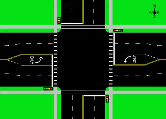 intersection of two-way streets as seen from above (traffic flows on the right side of the road). The east–west street has left turn lanes from both directions, but the north–south street does not have left turn lanes at this intersection. The east–west street traffic lights also have green left turn arrows to show when unhindered left turns can be made. Some possible markings for crosswalks are shown.