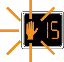 Flashing orange stophand: do not start to cross; if it appears during crossing, then continue to cross if unable to stop safely