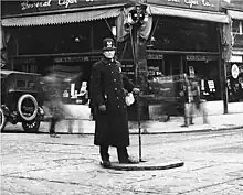 A Seattle Police Department officer directing traffic in downtown Seattle, 1922. Some early intersections featured concrete islands for traffic lights and traffic officers.