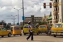 A Nigeria Police Force officer directing traffic at a busy intersection