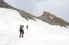 What faces a visitor to Pindari glacier at the Zero Point, along its left lateral moraine, is an immense wall of jagged, broken ice criss-crossed with thousands of seracs and crevasses. The upper icefields of the glacier are invisible from there and the near level ice mass at its lower end at the snout below recedes into insignificance. What people call the Pindari glacier is actually a huge icefall passing over a steep slope, through which a direct ascent has yet to be made. Above this lie the icefields of the surrounding heights and the névé basin of the glacier, some 8 km long, separated from the ridge above with a text-book fashion bergschrund. The lowest point on the ridge at 5312 m is the Trail's Pass. Beyond the pass to the north and east lies the Lwan valley whose catchment is the Gori ganga valley.