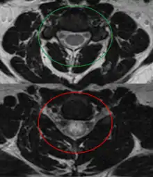 Axial T2 MRI of cervical spine demonstrating normal cord signal (green circle) and increased T2 signal in the central cord (red circle).