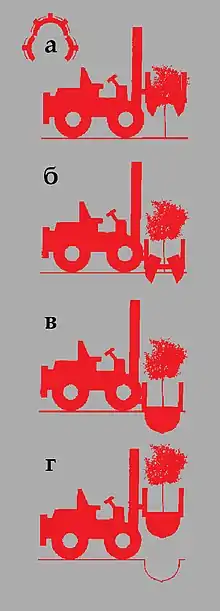The machines can be mounted on a tractor or loader for moving trees a short distance, or on the back of a truck[2][3] for relocating trees over the highway a long distance away. For tree nursery operations, tree spades are also sometimes mounted on excavators, though this is less common due to the weight capacity requirements of manipulating the machine along with an excavated tree. For transport on public roads, the spade tilts the tree to a near-horizontal position in order to clear overhead bridges and cables.