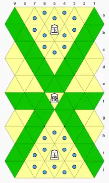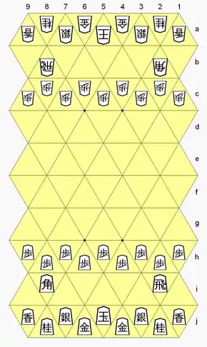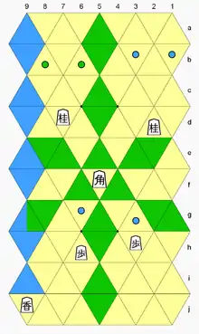 Trishogi is a shogi variant for two players created by George R. Dekle Sr. in 1987.[1][2] The gameboard comprises 9×10 interlocking triangular cells. The game is in all respects the same as shogi, except that piece moves have been transfigured for the triangular board-cell geometry.