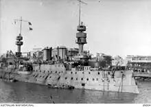 Steel warships especially of the early 1880s frequently demonstrate tumblehome, though it has been an influential factor in their design ever since their beginnings. One of the first ironclad warships, the CSS Virginia of 1862, could be considered an early example of this integral trend. However, France in particular promoted the design, advocating it to reduce the weight of the superstructure and increase seaworthiness by creating greater freeboard.[2] A French yard was contracted to construct the pre-dreadnought battleship Tsesarevich along the lines of France's Jauréguiberry, which was delivered to the Russian Imperial Navy in time for it to fight as Admiral Wilgelm Vitgeft's flagship at the Battle of the Yellow Sea on 10 August 1904. The Russo-Japanese War proved that the tumblehome battleship design was excellent for long-distance navigation, but could be dangerously unstable when watertight integrity was breached.[3] Four tumblehome Borodino-class battleships, which had been built in Russian yards to Tsesarevich's basic design, fought on 27 May 1905 at Tsushima. The fact that three of the four were lost in this battle resulted in the discontinuing of the tumblehome design in future warships for most of the 20th century.