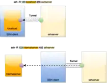 A Secure Shell (SSH) tunnel consists of an encrypted tunnel created through an SSH protocol connection. Users may set up SSH tunnels to transfer unencrypted traffic over a network through an encrypted channel. It is a software-based approach to network security and the result is transparent encryption.[6]