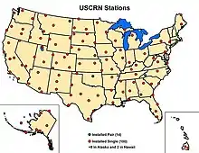 The USCRN is made up of over 143 stations in the United States. Its purpose is to maintain a sustainable high quality network which will detect, with high confidence, signals of climate change in the US.[2] It provides the United States with a reference network that meets the requirements of the Global Climate Observing System.