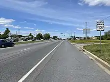 In 1950, recommendations were made by the chief engineer of the DSHD to widen US 13 into a divided highway between Delmar and Dover.[49] The divided highway was completed from Hearne's Mill north to just south of Greenwood in 1952. The highway bypassed Bridgeville to the east, rerouting US 13 off Main Street in that town.[50][51] In 1953, the divided highway portion of US 13 was built around Seaford.[52] The divided highway was completed between the Maryland border in Delmar and Hearne's Mill and from Harrington to Dover in 1954.[53][54][55] The new alignment of US 13 between Delmar and Hearne's Mill was built further to the east, with the former two-lane alignment running through Delmar, Laurel, Blades, and Seaford becoming US 13 Alt. The bypassed two-lane alignment between Canterbury and Camden was also designated as US 13 Alt.[55] In 1956, work was underway in widening US 13 into a divided highway between south of Greenwood and Harrington.[56] The widening of this portion of US 13 was finished in 1957, completing widening US 13 to a divided highway between Delmar and Wilmington.[41] By 1957, the former alignment of US 13 in Bridgeville along Main Street was designated US 13 Alt. (now US 13 Bus.) while US 13 Alt. between Delmar and Hearne's Mill was decommissioned.[57]