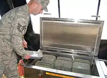 The Unitized Group Ration – Express (UGR-E or UGR-Express), nicknamed the "kitchen in a carton", consists of meals in self-heating steam table trays based on the UGR-H&S meal offerings. The UGR-E is designed to provide hot meals where feeding a group with hot food would otherwise be unfeasible; unlike other UGRs, it uses a flameless ration heater and does not require a separate field kitchen. The UGR-E begins heating with the pull of a tab, and can fully heat a meal within 30 to 45 minutes. The UGR-E has an offering of 4 breakfast menus, 8 lunch/dinner menus, and 1 holiday menu; each meal provides an average of 1,300 kcal. Each UGR-E module contains 18 meals, with each pallet holding 400 meals. UGR-E modules have a minimum shelf life of 18 months at 80 °F (26.6 °C).[14][16][17]