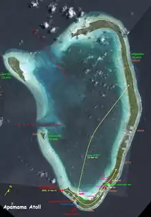 The submarine approached the island while remaining submerged and observed the island from less than 1,000 yards by periscope.[5] A strong current made it impossible for the Nautilus to remain underwater and had to resurface, while the shore battery was still intact.[22] No further incidents occurred with the shore battery, however, and by 1930, the strong current dissipated to allow Nautilus to re-submerge. Meanwhile, the rescue mission was canceled and Nautilus continued to proceed south to Apamama.