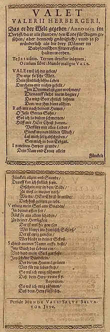 The hymn's first word, "Valet", is derived from the Latin valete (fare thee well) in the original imprint: Herberger arranged his own Christian name "Valerius" as an acrostic—the first letters of each of the five stanzas form his name, Vale R I V S.[3] The hymn text was first printed in Leipzig in 1614.[4]
