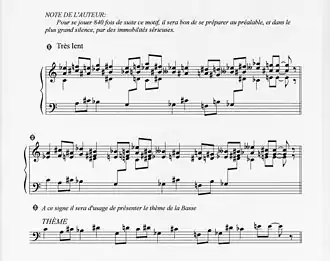 - No metronomical tempo indication: the score mentions "Très lent" (very slow), which could mean anything while the composition has not a melody that could be experienced as falling in one or another "natural" cadence – at least not at first sight: some (e.g. the pianist Armin Fuchs, who executed the work in its entirety several times) argue there is a natural cadence nonetheless (26 quarter-note beats per minute in Fuchs' case, which extends total execution to 28 hours)[7]