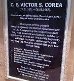 A plaque detailing the heroic exploits of Sri Lankan national hero, Victor Corea.