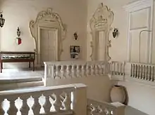 Vilhena Palace is a large building which is considered to be "an excellent example of French Baroque." It has a U-shaped forecourt surrounded with loggias, which follows the plan of the original castle, and it possibly contains some remnants of the 16th century palace incorporated into the structure.[2][7] The forecourt is approached through a gate decorated with Vilhena's coat of arms. The central façade of the palace contains the ornate main doorway, which is flanked by Corinthian columns and is surmounted by a bronze relief of De Vilhena and another coat of arms.[8]