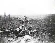The only portion of the Canadian assault that did not go as planned was the advance of the 4th Canadian Division, collapsing almost immediately after exiting their trenches.[100] The commanding officer of one of the assaulting battalions requested that the artillery leave a portion of German trench undamaged.[101] Machine gun nests in the undamaged sections of the German line pinned down, wounded, or killed much of the 4th Canadian Division's right flank. The progress on the left flank was eventually impeded by harassing fire from the Pimple that was made worse when the creeping barrage got too far ahead of the advancing troops.[102][103] In view of the German defence, the 4th Canadian Division did not attempt a further frontal assault throughout the afternoon.[104]